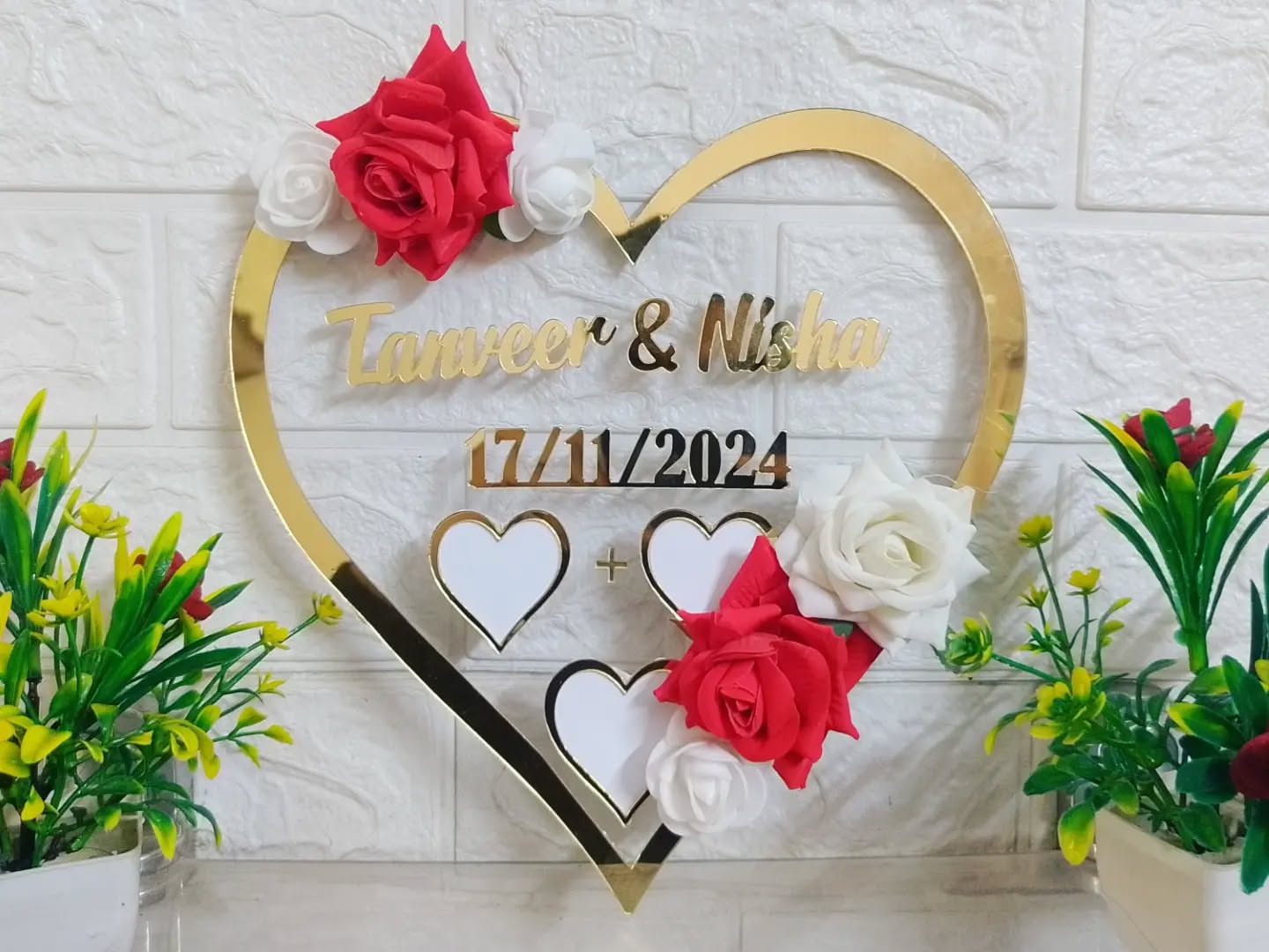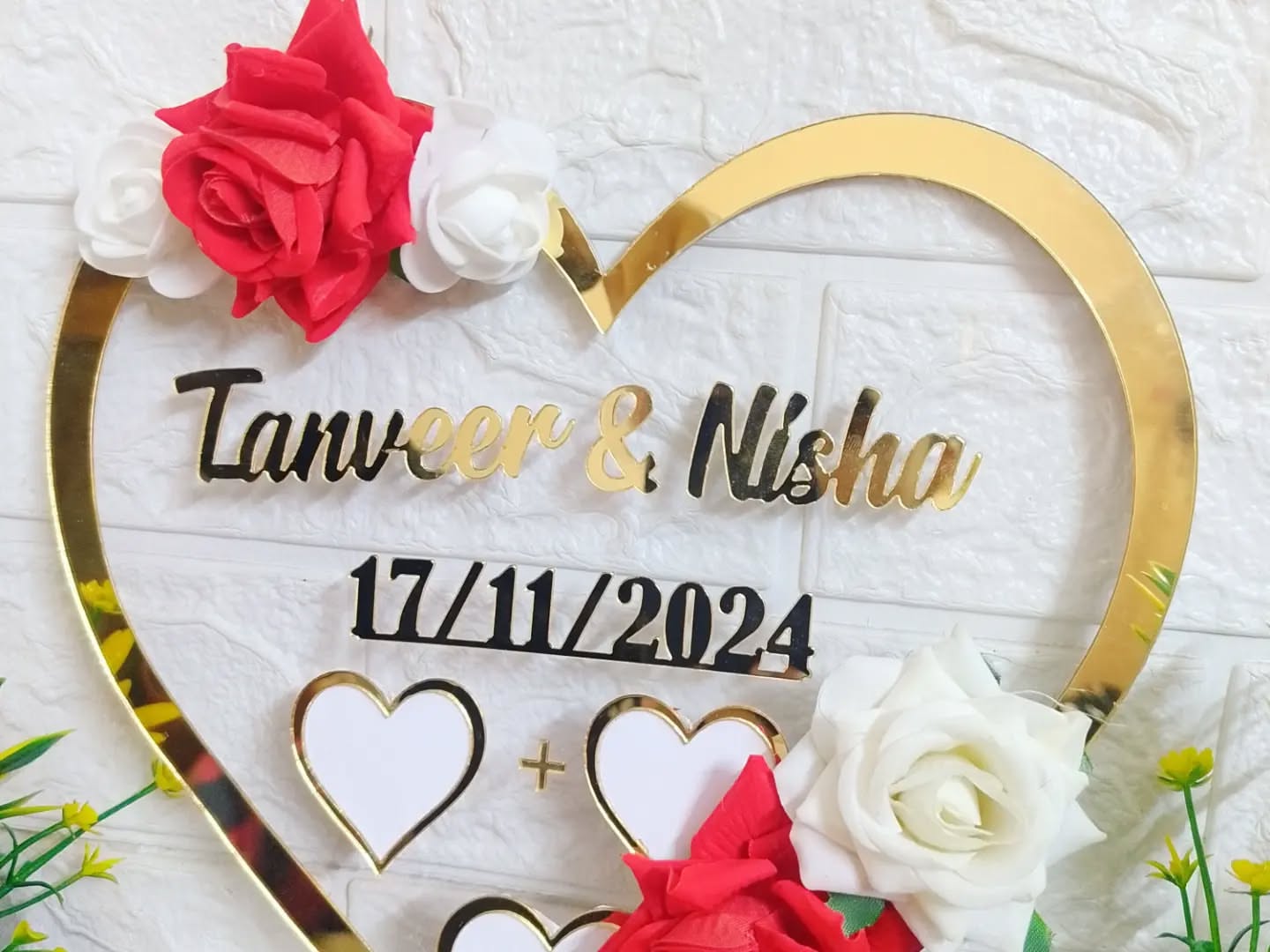 A beautiful heart-shaped Nikah frame customized with your names, Nikah date, and details. Elegant, stylish, and perfect as a keepsake or home décor to cherish your special day.