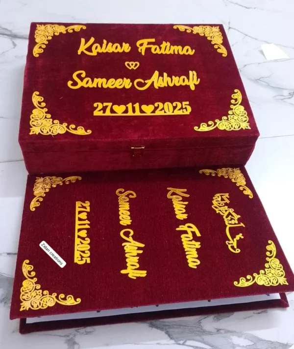 A premium Nikah Nama booklet with a matching box, fully customizable with your names, date, and design — elegant and perfect for your special day.